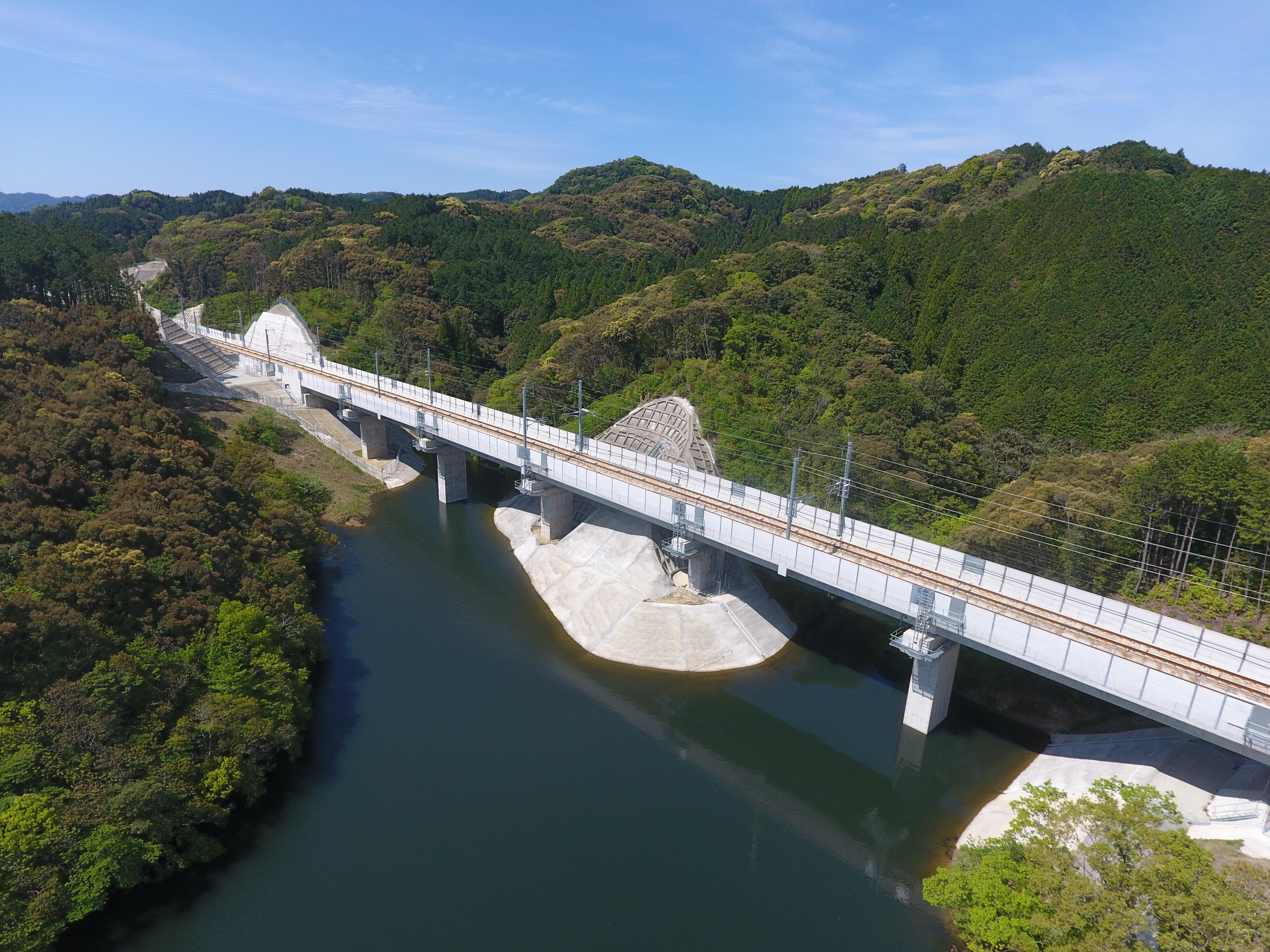 GRS一体橋梁は、橋桁と耐震性の高い補強土橋台を一体化した橋梁であり、機構は2011年に北海道新幹線、中学校線架道橋に世界で初めて建設しました。その後、耐津波性が高い橋梁として東日本大震災で被災した三陸鉄道の橋梁復旧にも適用しました。九州新幹線(西九州)、原種架道橋は、従来までの適用スパンを拡張するためにPC構造を初めて採用した橋長30mの長スパンGRS一体橋りょうです。