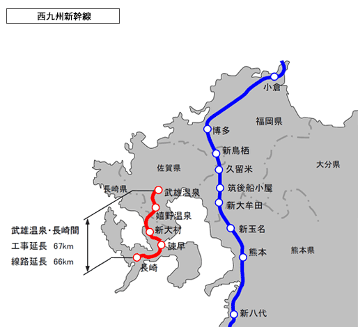 西九州新幹線(武雄温泉・長崎間)は延長約66kmの路線であり、平成20年(2008年)3月に武雄温泉・諫早間で暫定整備計画(スーパー特急方式)として工事実施計画の認可を受け、工事に着手しました。平成24年(2012年)6月に武雄温泉・長崎間で標準軌による工事実施計画の認可を受け、令和4年(2022年)9月23日に開業しました。